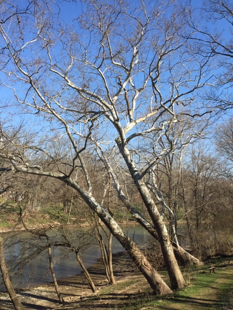 Sycamore trees are abundant in Kentucky. In the winter months the peeling white bark of the sycamores can be seen clearly along creek banks in this region.